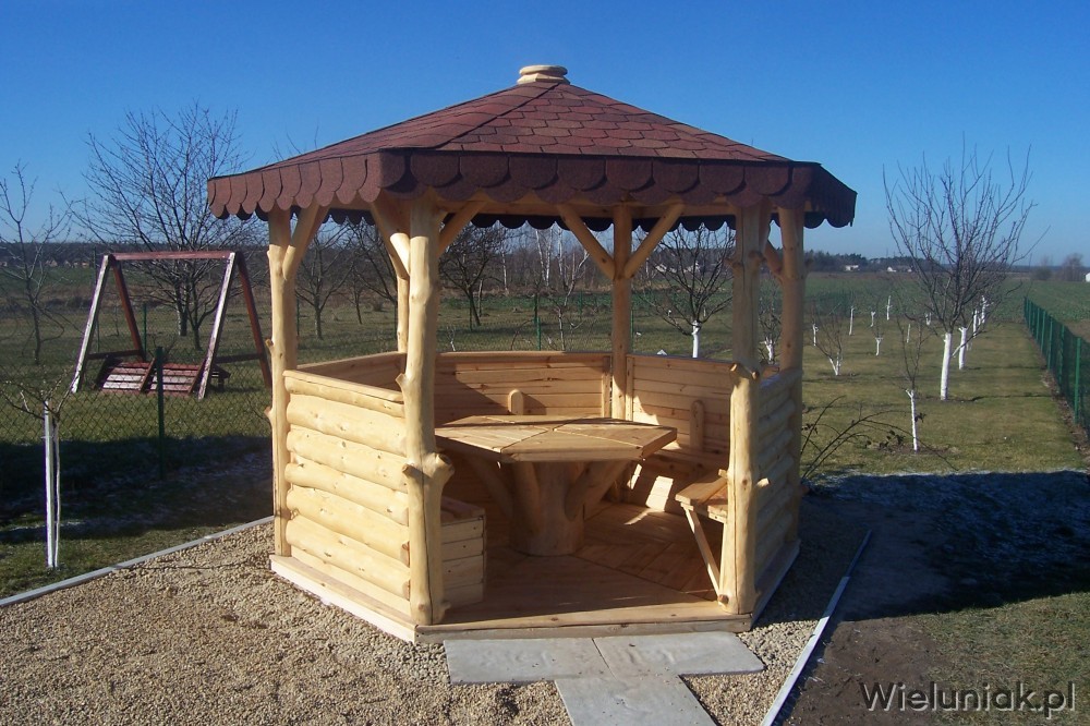 1. Słupy altany wykonane z bali z naturalną krzywizną średnicy ok. 12 cm, wys. całkowita do 270 cm,