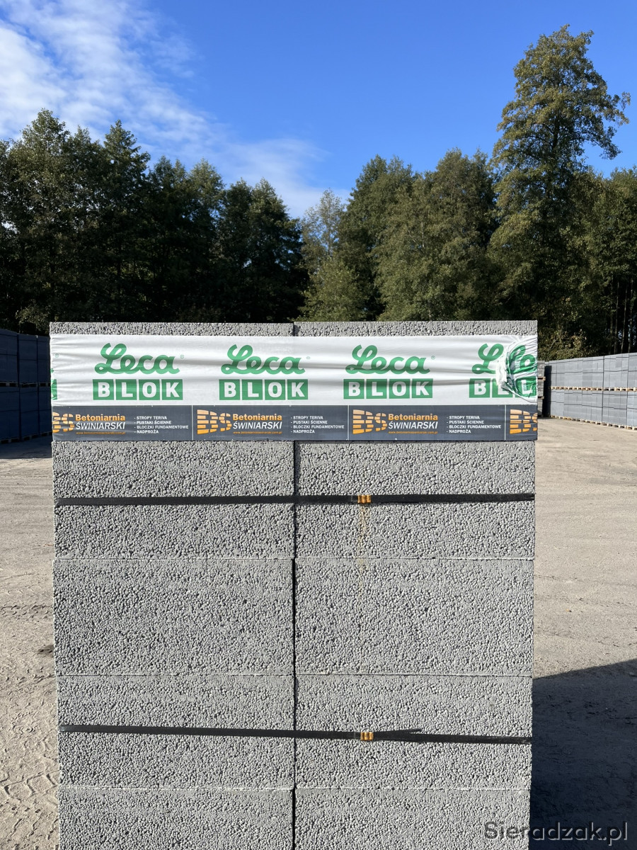 Keramzytobetonowe pustaki Leca BLOK 24. Przeznaczone są do wznoszenia ścian zewnętrznych i wewnętrznych. Mają bardzo dobre parametry Izolacyjności termicznej. Ściany zewnętrzne można wykonać jako jedno-,dwu-(Pustak Leca Blok 24 + izolacja termiczna ) lub trójwarstwowe ( Pustak Leca Blok 24+izolacja termiczna i pustka powietrzna + Pustak Leca Blok 12). Zużycie pustaków Leca Blok - 8sz/m2,