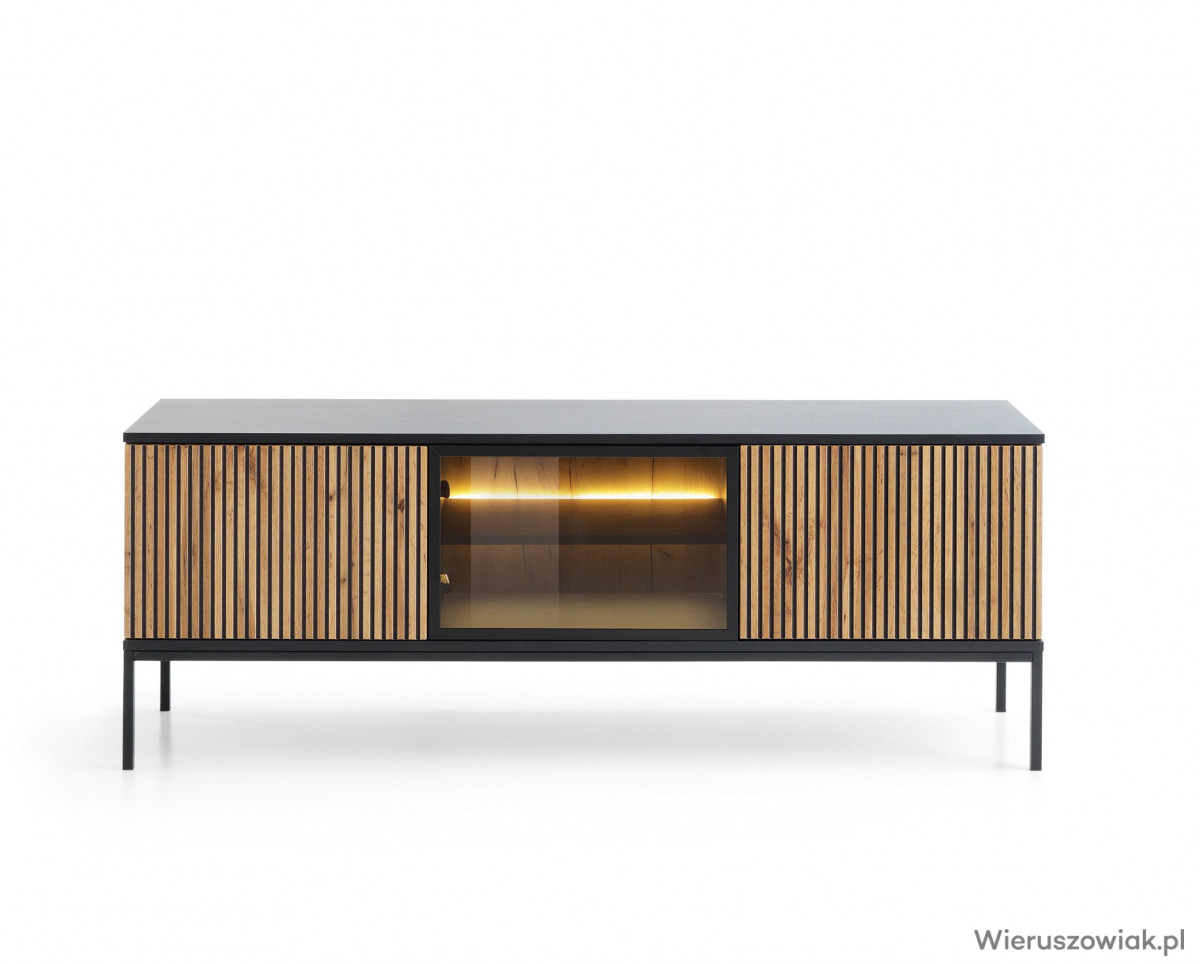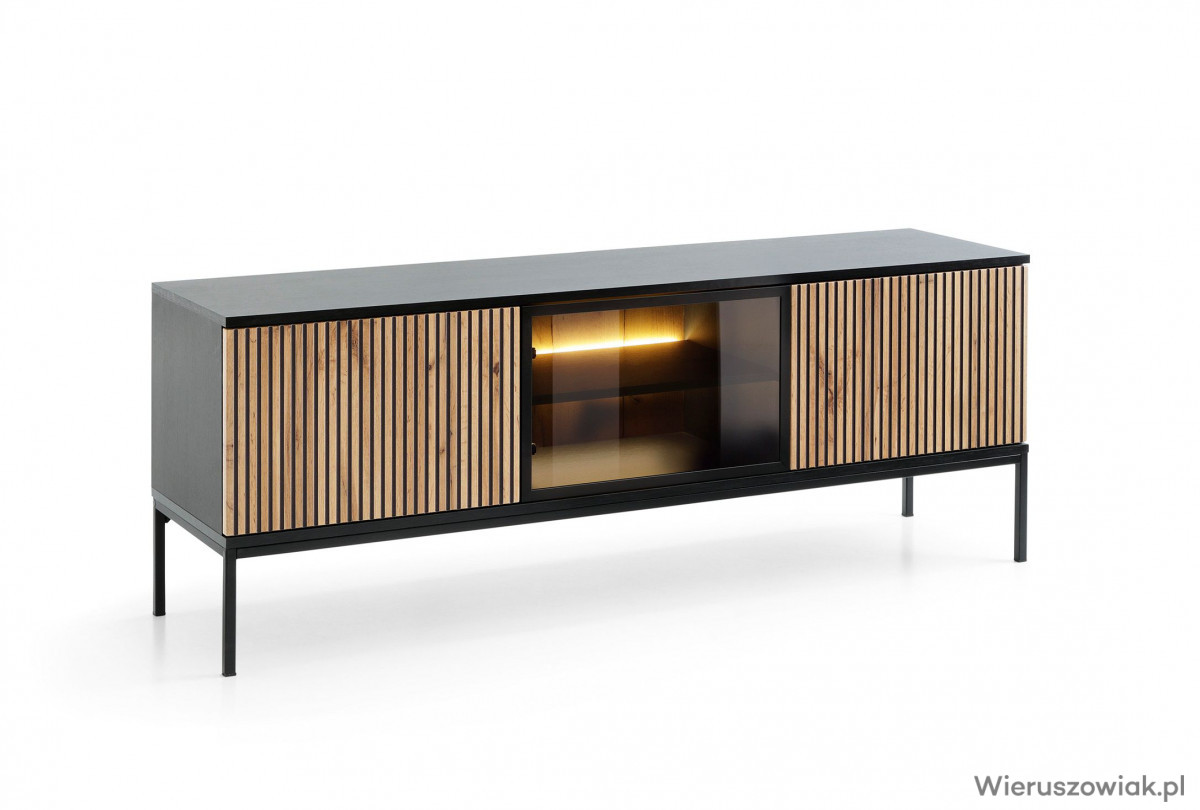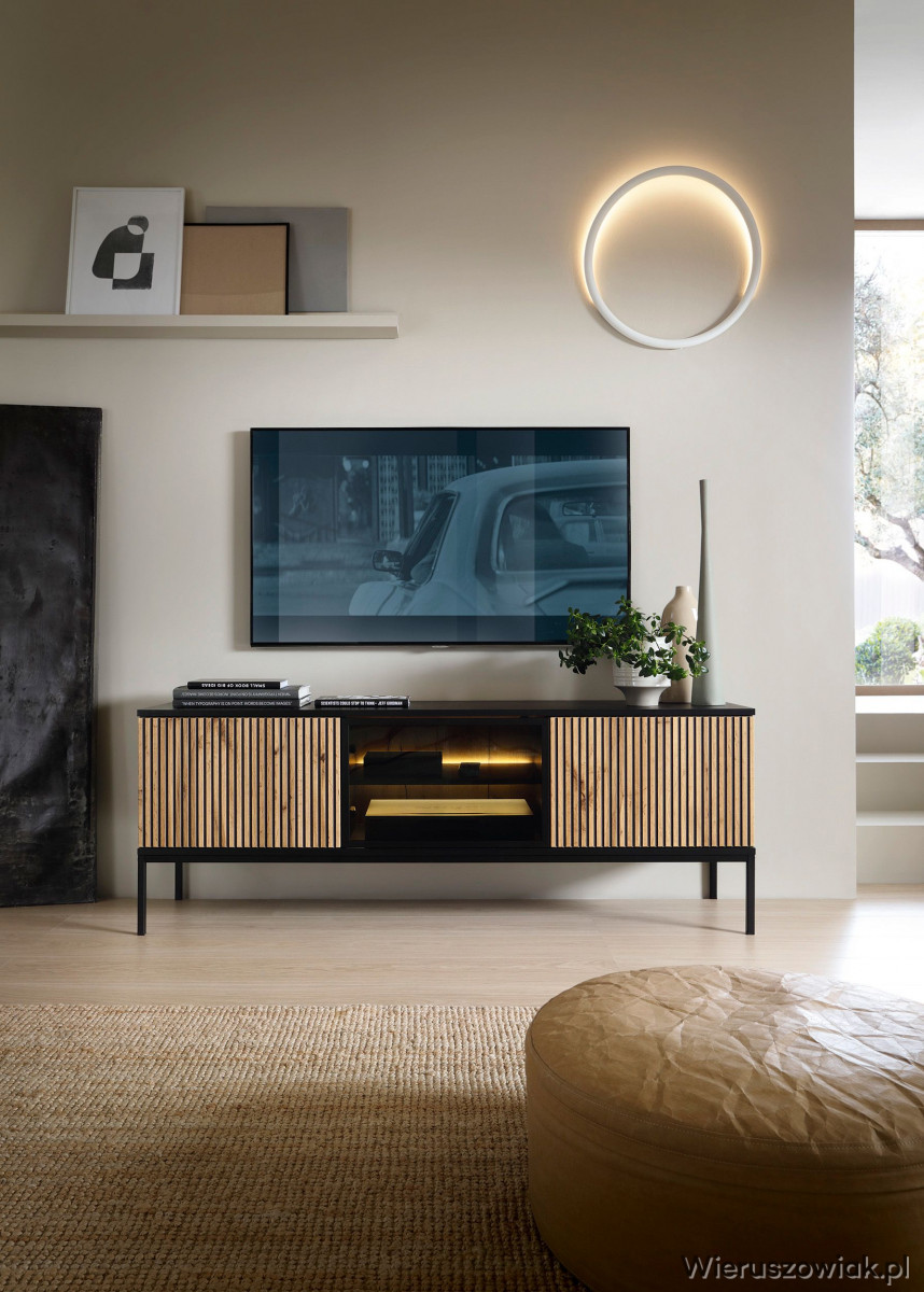 Szafka RTV VENTO to nowoczesny mebel, który łączy styl i funkcjonalność. Wykonana z wysokiej jakości materiałów, charakteryzuje się eleganckimi frontami 3D z lamelami w kolorze czarnym i dębu wotan, co nadaje jej wyjątkowego charakteru. Przestronny blat pomieści telewizor oraz inne urządzenia multimedialne, a zamykane szafki i otwarta półka oferują wygodne miejsce na przechowywanie sprzętu oraz dekoracji. Inteligentnie zintegrowane oświetlenie LED wewnątrz mebli podkreśla ich walory estetyczne, tworząc jednocześnie przytulną atmosferę w każdym wnętrzu. Dzięki swojemu designowi, szafka RTV VENTO idealnie wpisuje się w nowoczesne wnętrza, tworząc harmonijną przestrzeń w Twoim domu.