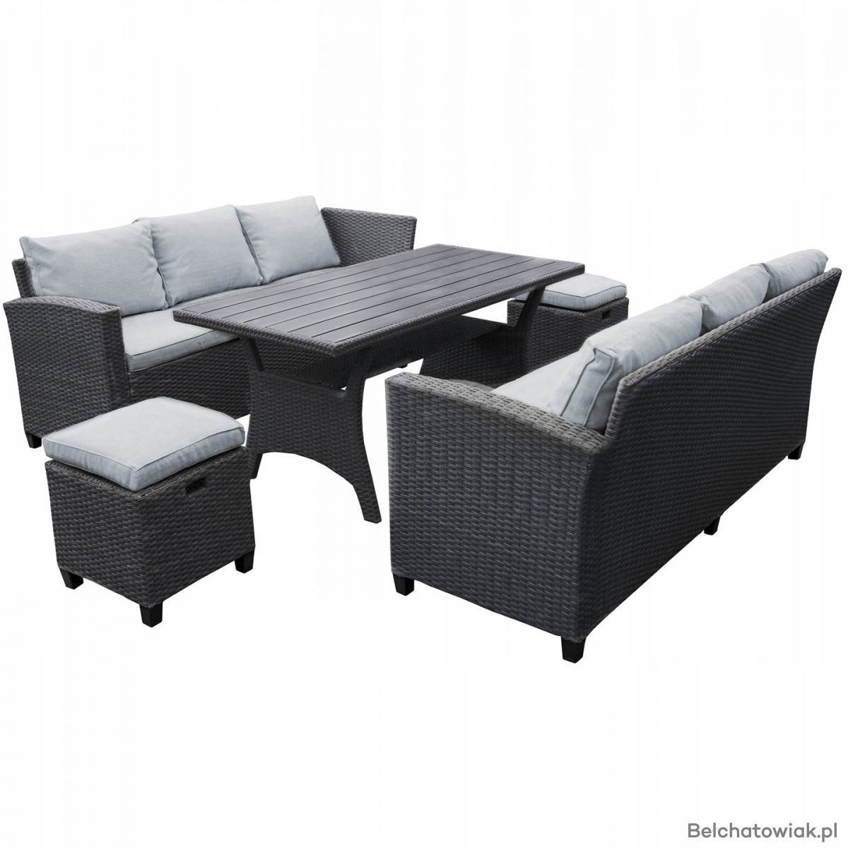 Zestaw wyposażony jest w grube, wygodne poduszki, a dwie praktyczne pufy uzupełniają całość, zapewniając komfort wypoczynku i dodatkowe miejsca do siedzenia.