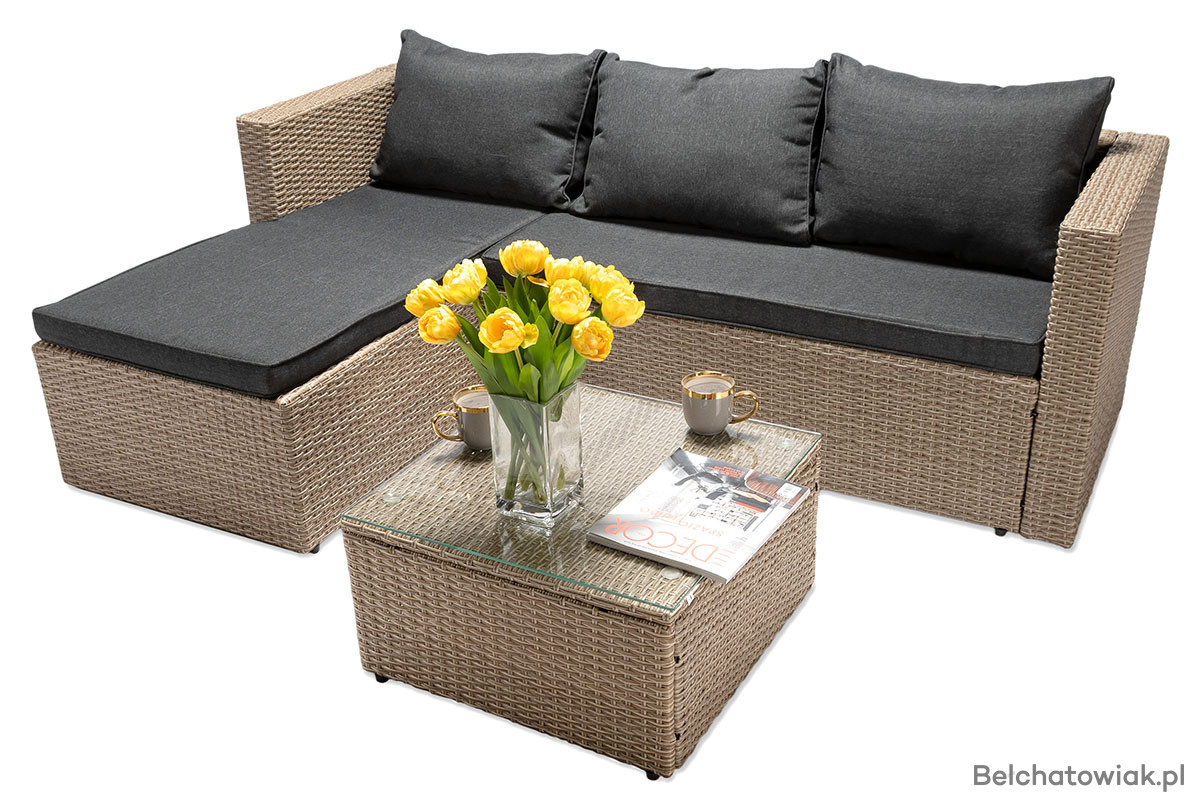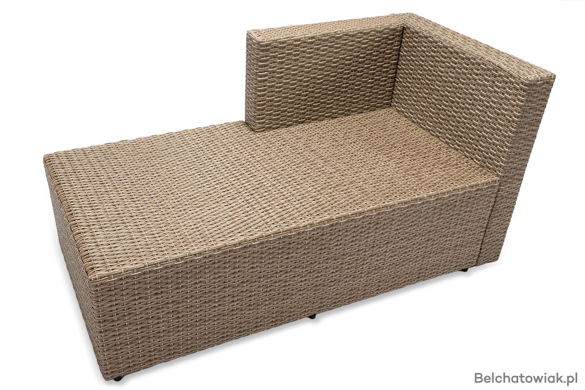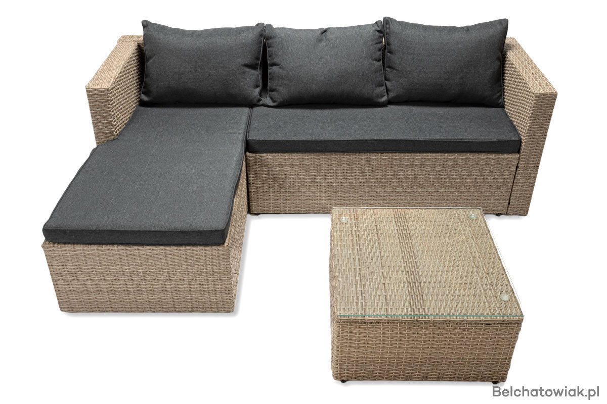 Lewostronny układ narożnika oznacza, że dłuższy bok znajduje się po lewej stronie (patrząc na mebel z przodu). To ważne przy planowaniu przestrzeni – ten model doskonale sprawdzi się w miejscach, gdzie klasyczny narożnik prawostronny się nie zmieści lub nie pasuje do układu ogrodu czy tarasu.